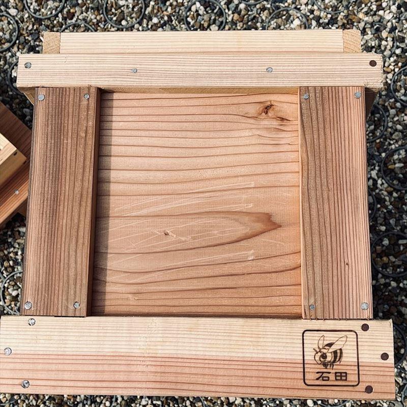 内地杉(国産杉)を100%使用し1つ1つ手作りで作製された日本ミツバチ用の巣箱です。厳選したフシが少ない杉材で、製材後数年寝かした板を